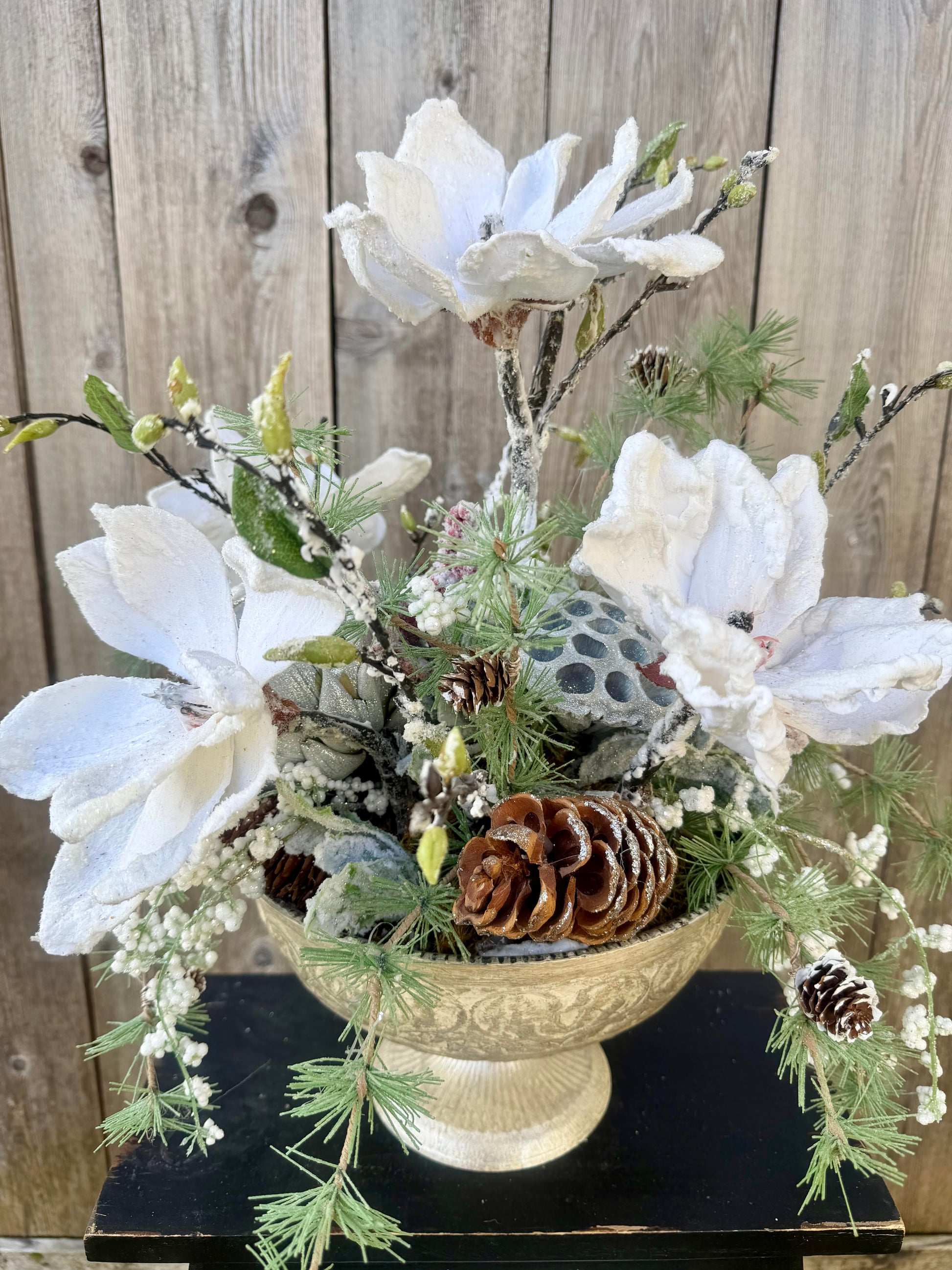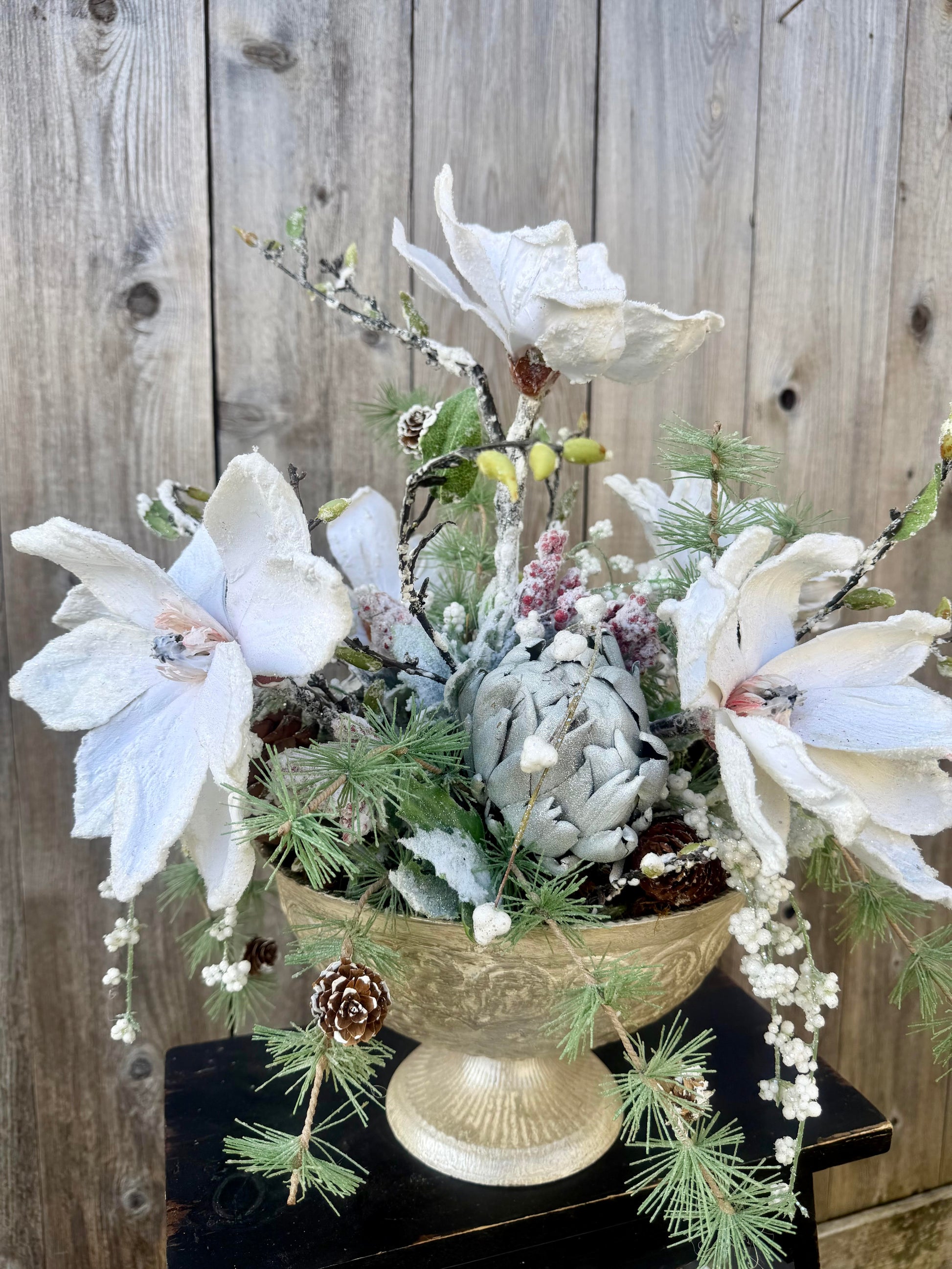Bring the quiet magic of winter indoors with this handcrafted frosted floral centerpiece. Designed with a soft, snowy aesthetic, this arrangement features large white magnolias, pine sprigs, textured greenery, and realistic frosted berries, all nestled inside a vintage-inspired pedestal vase.