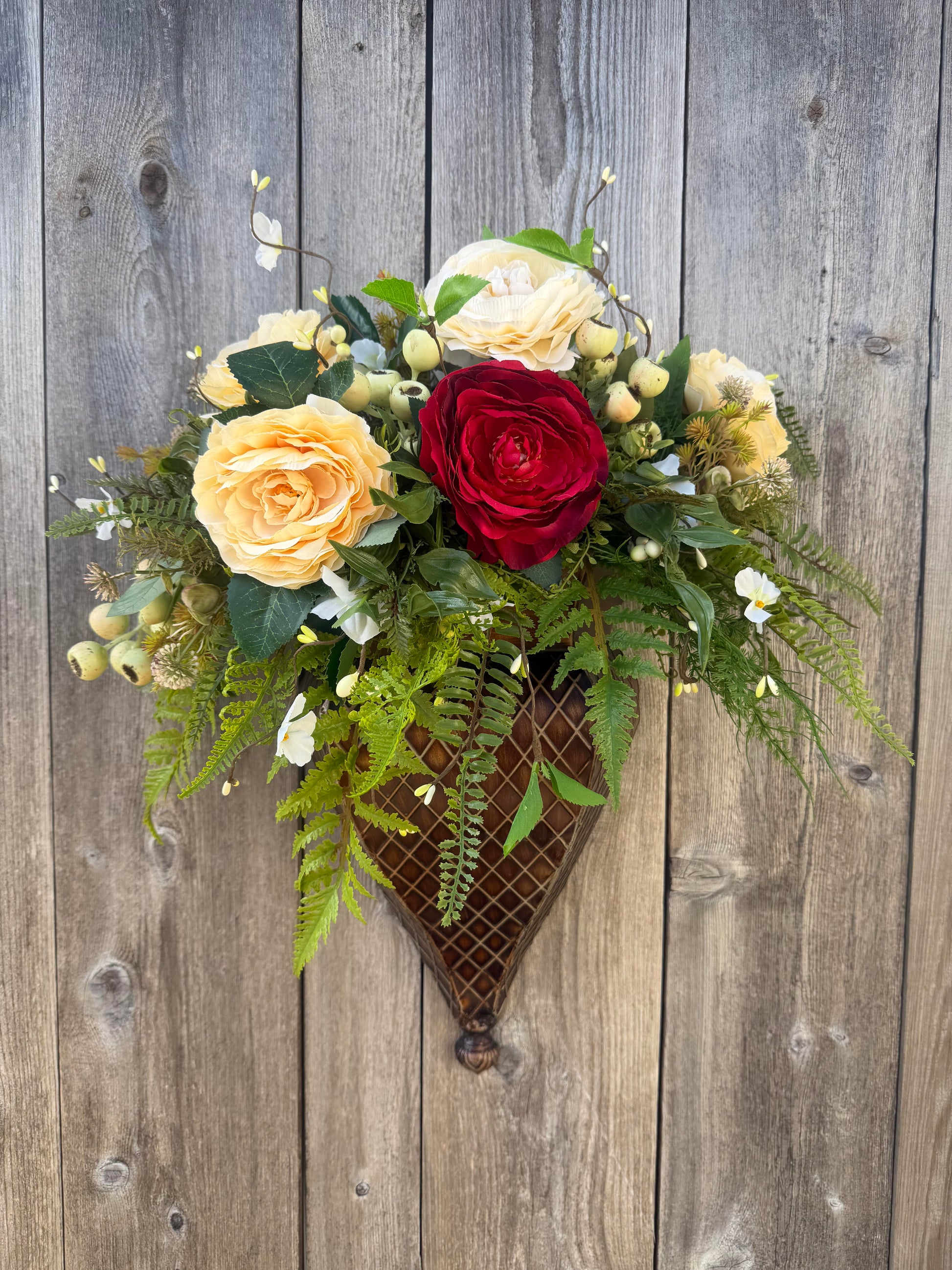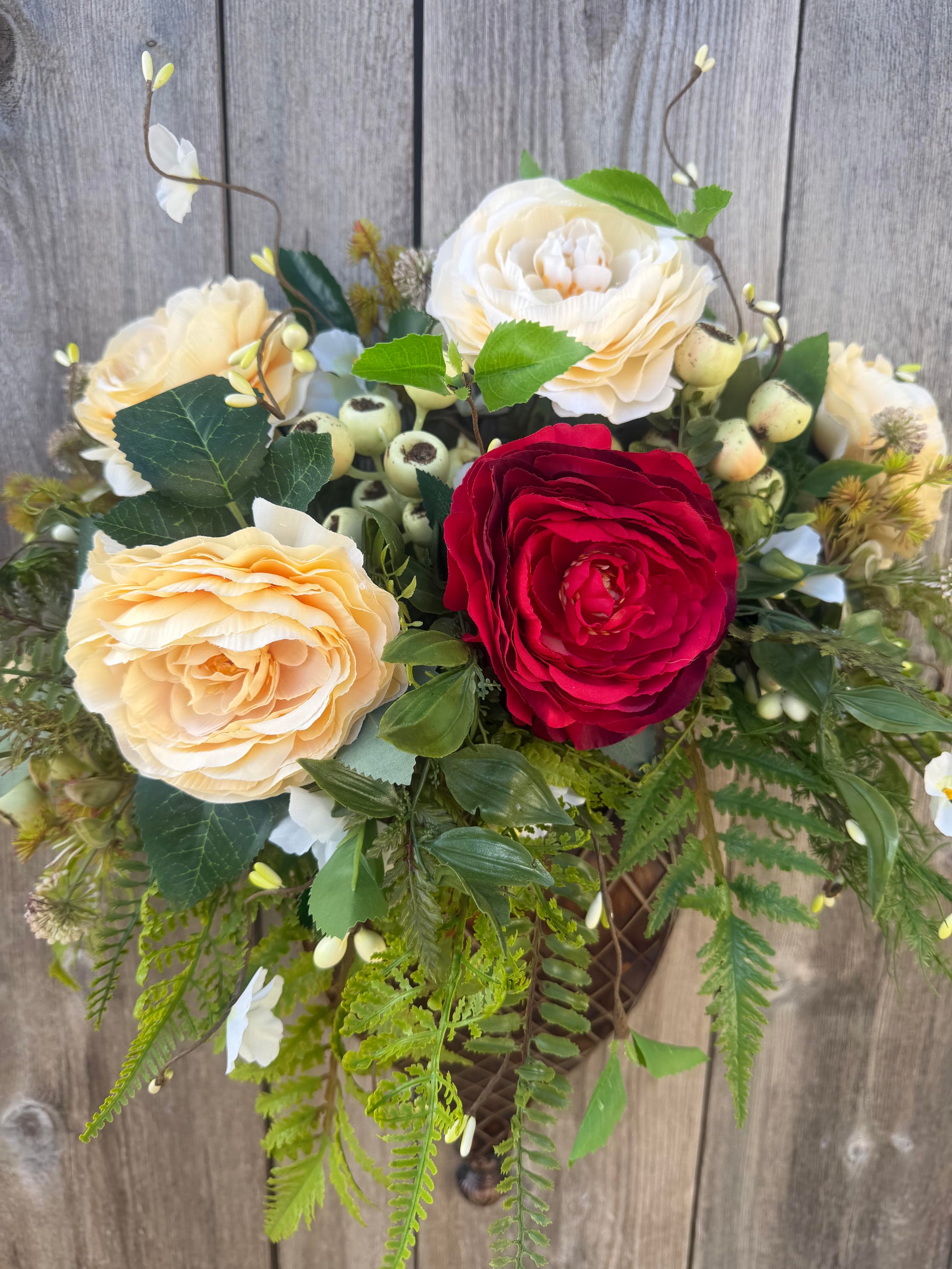Add instant charm to any room with this red and cream floral arrangement in a rustic brown hanging container. Easy to display, beautiful to admire, and designed to last. A perfect accent piece for any home.