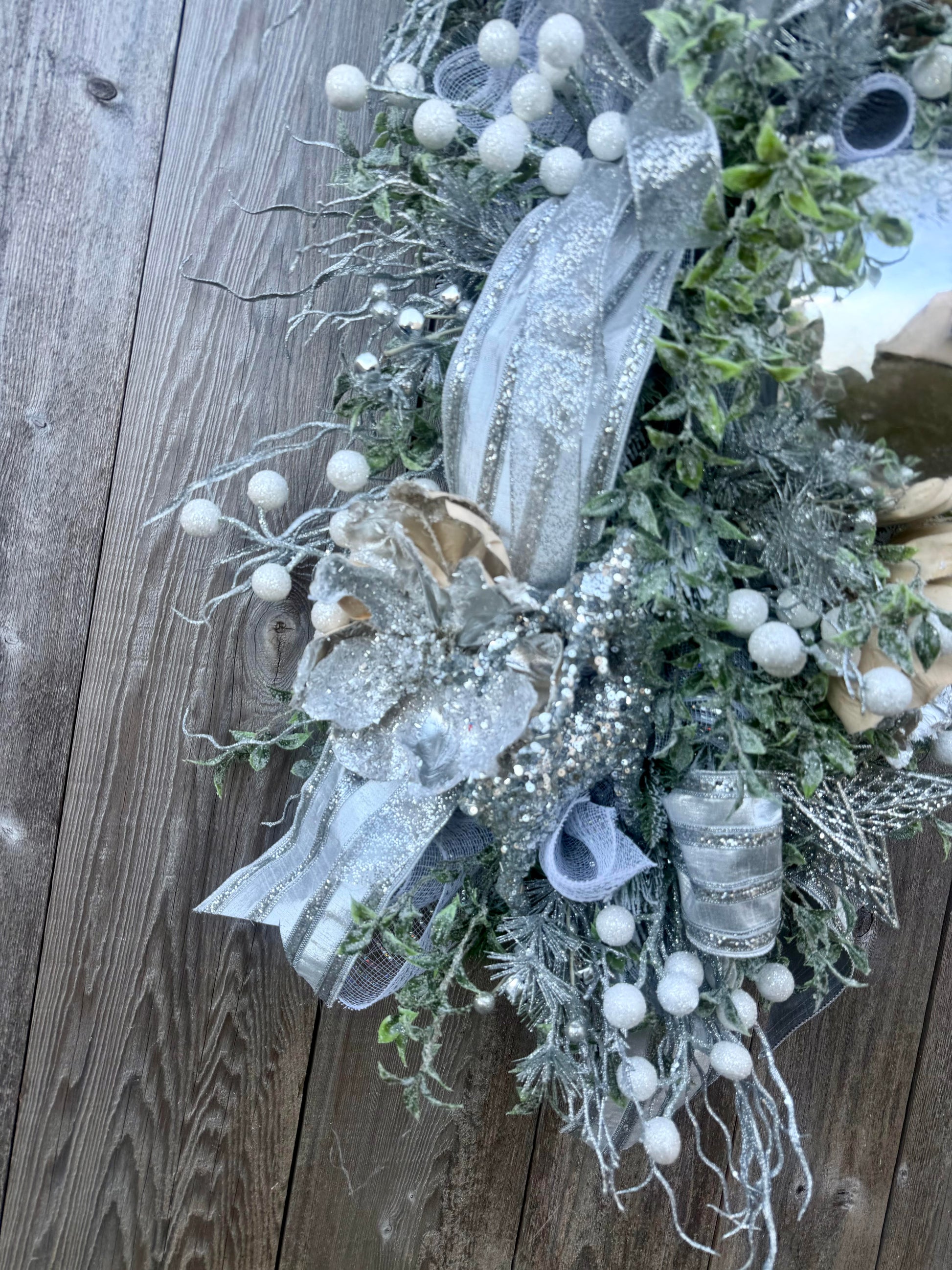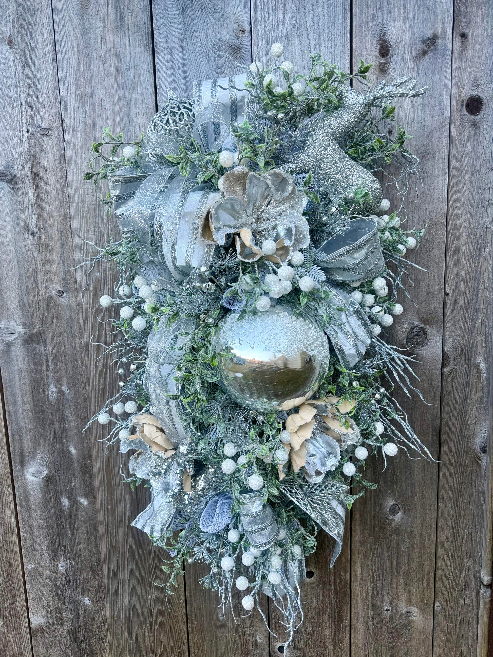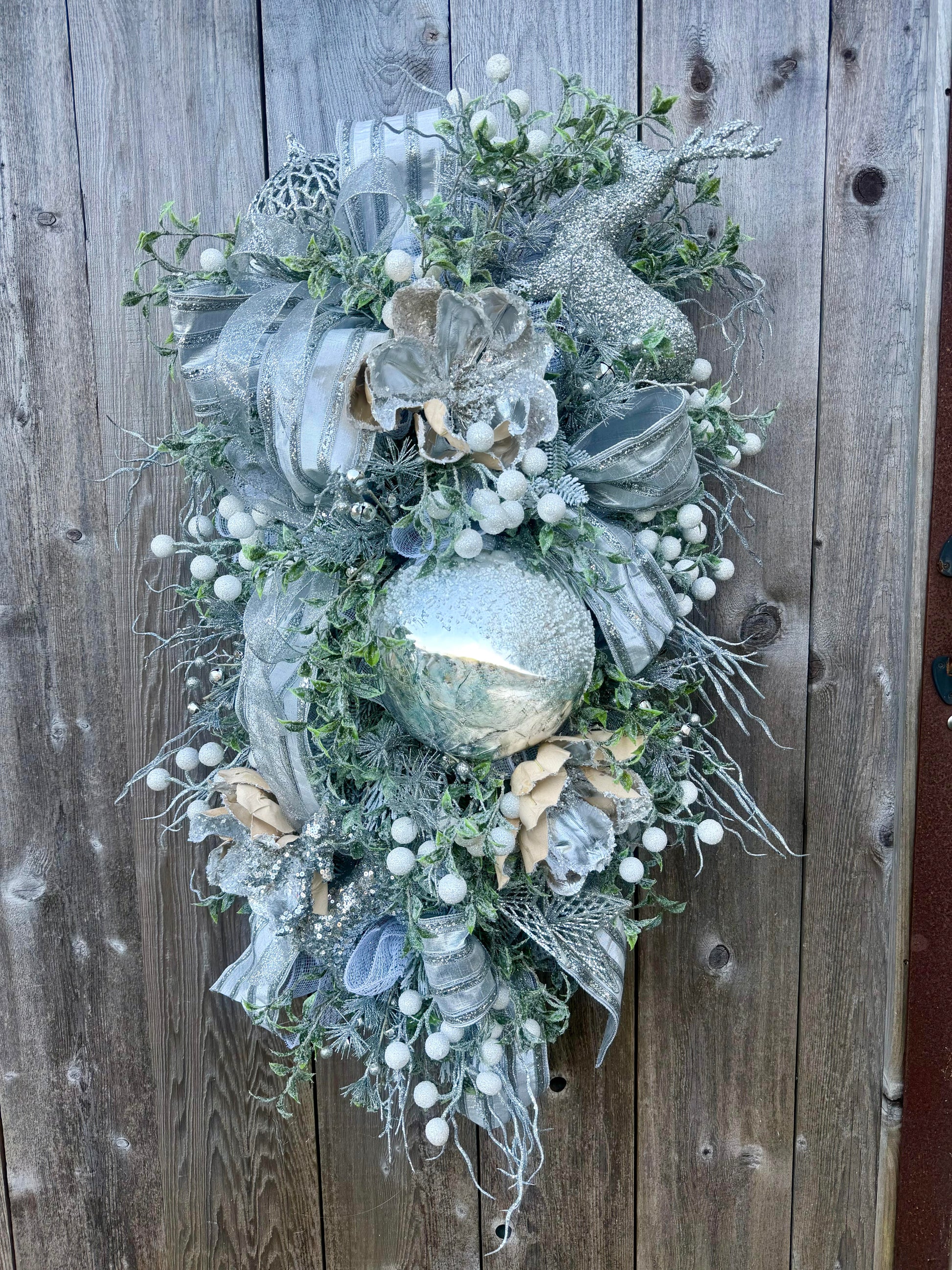 Transform your home into a winter wonderland with our Silver and White Christmas Swag! Perfect for adding a touch of elegance to your holiday decor, this large door hanger features a stunning combination of white and silver. Bring the magic of the season to your doorstep with this beautiful swag.
