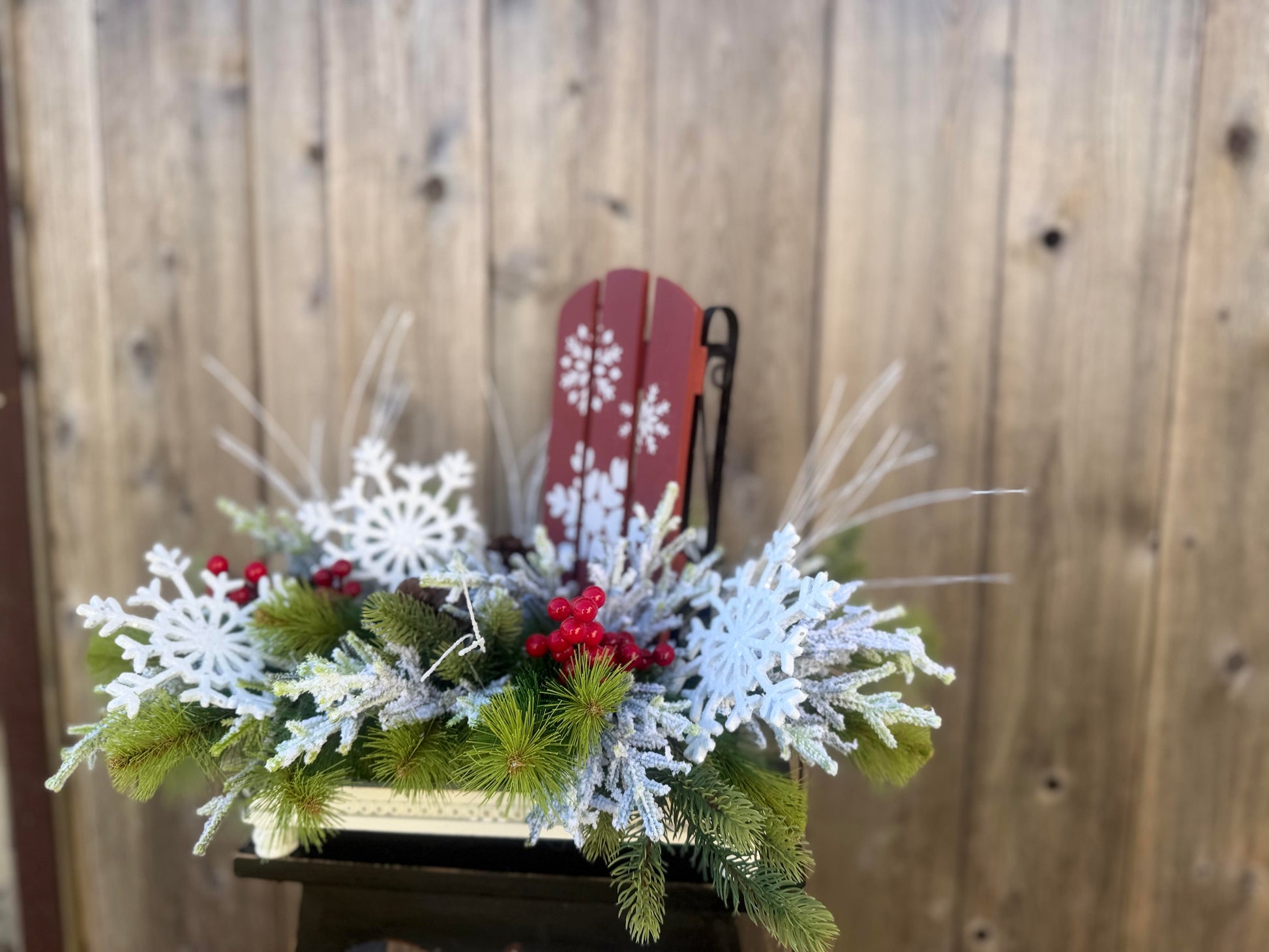 Transform your holiday table into a winter wonderland with this stunning sleigh centerpiece. Featuring delicate snowflakes and lush winter foliage, it captures the magic of the season in one eye-catching display. Perfect for dining tables, mantels, or entryways, this piece brings festive charm and sophisticated elegance to any space. The carefully arranged combination of seasonal botanicals and sparkling accents creates a memorable focal point that guests will admire. Elevate your holiday décor with a centerpiece that truly celebrates the beauty of winter.